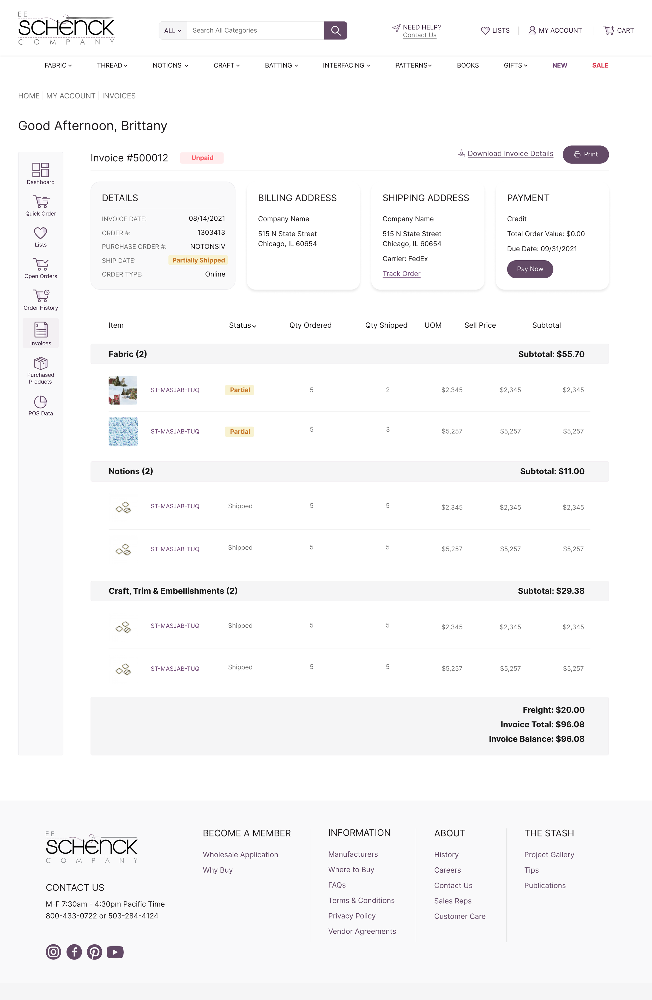 The Invoice page extends that philosophy, presenting purchases grouped into categories with subtotals that mimic the cart experience. Payment and shipping statuses are prominently displayed, so customers immediately understand what’s been ordered, where it is, and what’s next—removing guesswork and turning their account into a tool they can truly rely on.