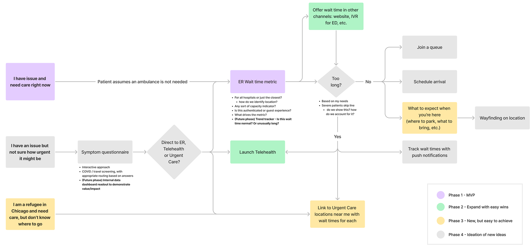 We explored the feasibility of displaying Emergency Department wait times to help patients make informed decisions during stressful moments, while also guiding those who saw the ER as their only option. I collaborated with our lead developer to map out a phased approach for enhancing the feature over time and capturing trend data for future improvements.